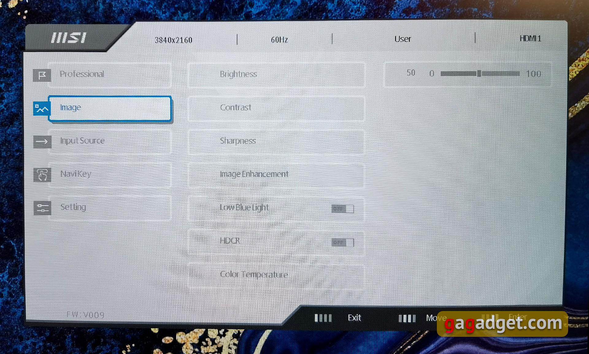 Het schermmenu van de monitor is verdeeld in 5 hoofdsecties. De eerste, die om de een of andere reden "Professional" heet, bevat het grootste aantal functies: kleurmodi, pixelresponstijd, vernieuwingsfrequentie (hoewel de maximale monitorfrequentie 60 Hz is, kun je deze lager instellen), timer, Screen Assastance (waarover hieronder meer), schermgrootte en Adaptive Sync-schakelaar. De tweede sectie is verantwoordelijk voor de beeldinstellingen, waaronder helderheid, contrast, kleurtemperatuur, blauwfilter, scherpte en beeldverbetering. De derde sectie bevat instellingen voor de monitoringangen. In het NaviKey-gedeelte kun je snelkoppelingen configureren voor de pijlen en de enter-toets. De laatste sectie bevat alle andere instellingen: interfacetaal, menutransparantie, reset, Type-C voedingsschakelaar, enz.