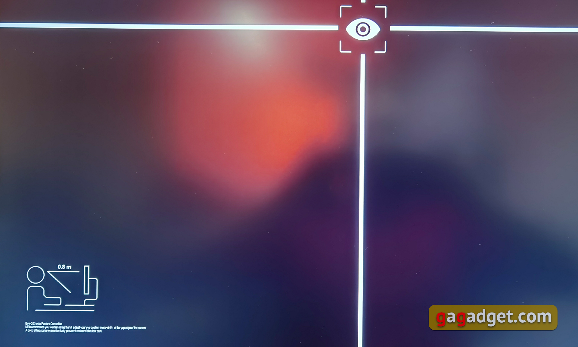 Laten we het nu iets meer hebben over het onderdeel Screen Assastance. Het heeft één functie die vrij bekend is bij gamemodellen - het schermraster - en een minder bekende optie genaamd Eye-Q Check. Het bevat 3 eenvoudige functies. Het Amsler-raster en Astigmatisme tonen de eerste afbeeldingen met lijnen op het scherm. Het is heel eenvoudig: als iets wazig is, moet je 20 minuten pauze nemen en iets anders gaan doen. De laatste functie is houdingscorrectie. Bovenaan het scherm wordt een horizontale lijn weergegeven. De ogen moeten er tegenover of iets eronder staan.