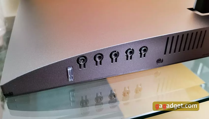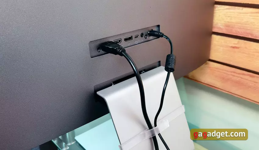 Alle aansluitingen bevinden zich in een kleine uitsparing net boven de standaard en wijzen naar achteren. Deze oplossing is erg handig als je vaak van kabel moet wisselen: je hoeft de monitor niet te verplaatsen of te kantelen.