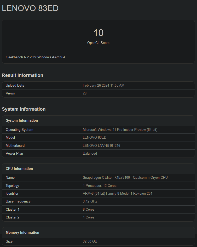 De Lenovo laptop heeft ook een onbekende Adreno GPU, die ook slecht presteerde in de Geekbench OpenCL tests en slechts 10 punten scoorde. De laptop heeft 32GB RAM en draait op Windows 11 Pro Insider Preview.