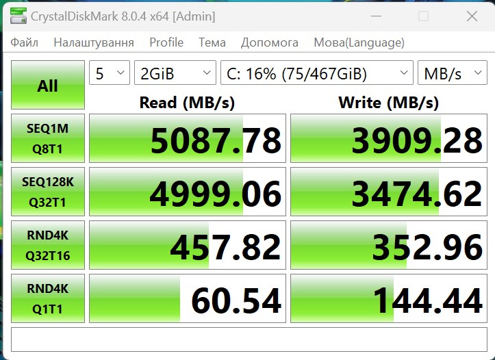 Deze blijkt behoorlijk snel te zijn. De leessnelheid bereikt 5000 MB/s en de schrijfsnelheid is bijna 4000 MB/s.