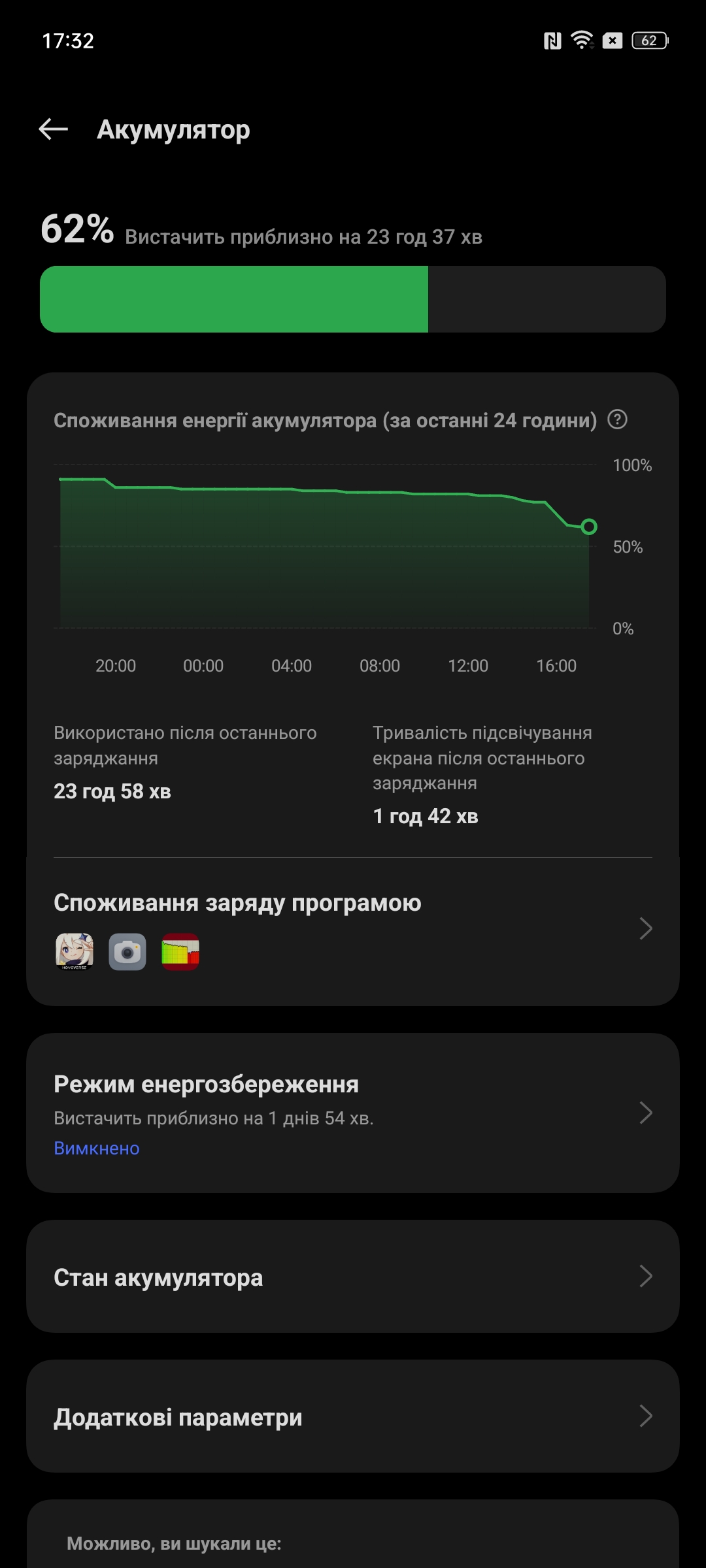De batterij in de smartphone is 5000 mAh, wat vrij normaal is voor moderne smartphones met grote schermen. OPPO A98 ondersteunt 67W SUPERVOOC snelladen. Ze beloven 50% in 18 minuten en een volledige lading in 44 minuten. Dit is ongeveer het geval in het echte leven. Volledig opladen duurt minder dan 50 minuten. De Battery Health Engine technologie zou de levensduur van de batterij aanzienlijk verlengen. De smartphone blijkt behoorlijk duurzaam te zijn. In de dagelijkse modus kun je rekenen op anderhalve dag gebruik als je niet te actief games speelt. Dit is ongeveer 20 minuten gesprekstijd, een paar uur muziek via Bluetooth, sociale netwerken, mail, video, browser, etc.