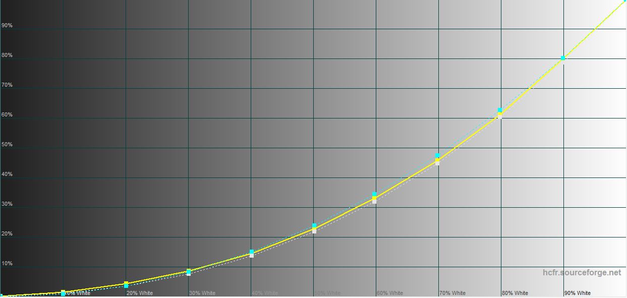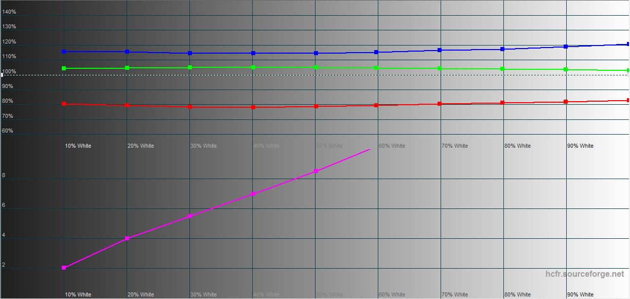 In de modus Natuurlijk liggen bijna alle indicatoren dicht bij Levendig. Behalve het kleurengamma. Dat is aanzienlijk smaller. Het maximale helderheidsniveau is 394,634 cd/m2, de helderheid in het zwarte veld is 0,395 cd/m² en het statische contrast is 999:1. cd/m2.