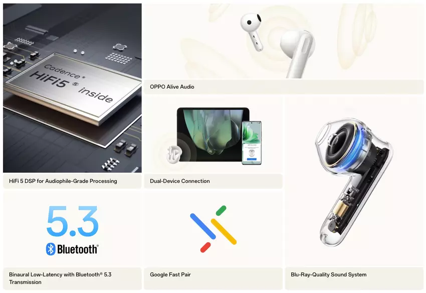 Het nieuwe product heet OPPO Enco Air3s. Het model heeft een ontwerp in de stijl van AirPods 3. De hoofdtelefoon is uitgerust met 13,4 mm drivers, Google Fast Pair-functie en Hi-Fi 5 audio processing chip, die verantwoordelijk is voor ruimtelijk geluid (Spatial Audio). De nieuwigheid is uitgerust met Bluetooth 5.3. Hierdoor kan de OPPO Enco Air3s verbinding maken met meerdere apparaten. Bijvoorbeeld met een smartphone en een laptop. Met één keer opladen gaat de hoofdtelefoon tot 25 uur mee (met een hoesje).