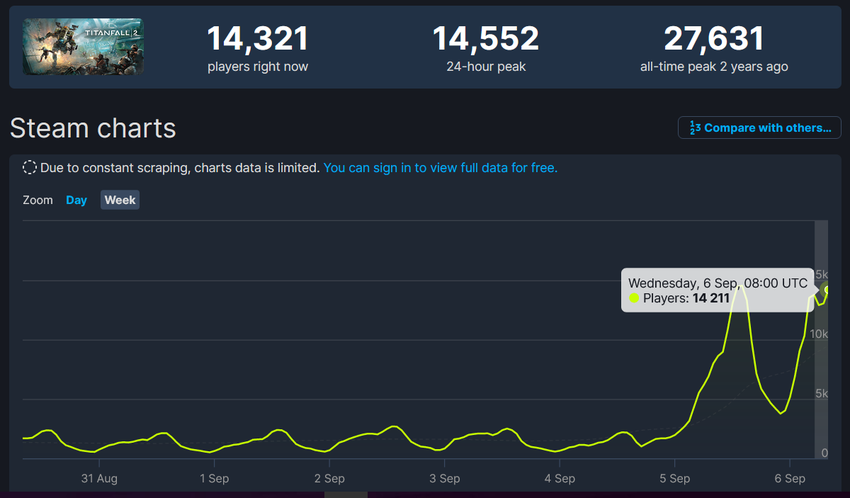 Als we kijken naar de geschiedenis van online games, dan zien we dat deze altijd zijn gestegen tijdens de verkoop en een maand later weer zijn gedaald naar de standaardwaarden. Dit keer zal het verhaal zich 100% herhalen, maar er is nog steeds een kleine kans dat Titanfall 2 erin slaagt om een nieuwe online piek neer te zetten. Het vorige record werd gevestigd op 29 april 2021, toen 27.000 gamers deelnamen aan online gevechten.