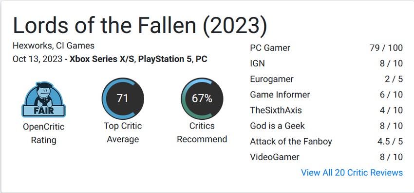 Op 13 oktober komt de soul-achtige Lords of the Fallen volledig uit, wat een herlancering is van de gelijknamige game uit 2014. Daags voor de release van de game hebben critici recensies gepubliceerd. De gemiddelde score van Lords of the Fallen is 7 punten.