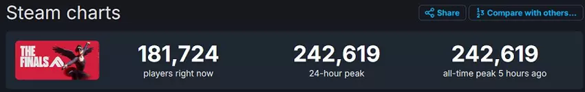 Volgens SteamDB overschreed de online piek van The Finals de 242 duizend mensen en dit cijfer heeft een hoog groeipercentage.