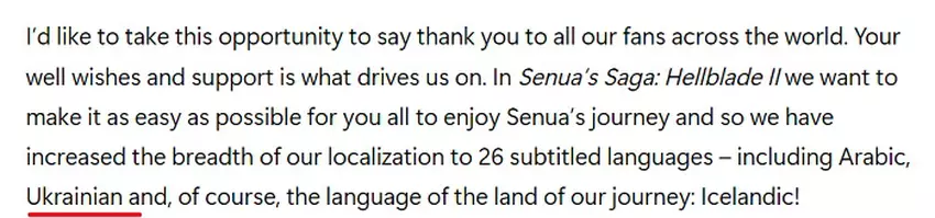 Hoofd van de Ninja Theory studio Dom Matthews zei in zijn notitie op de Xbox Wire website dat de game beschikbaar zal zijn in 26 talen, waaronder Oekraïens.