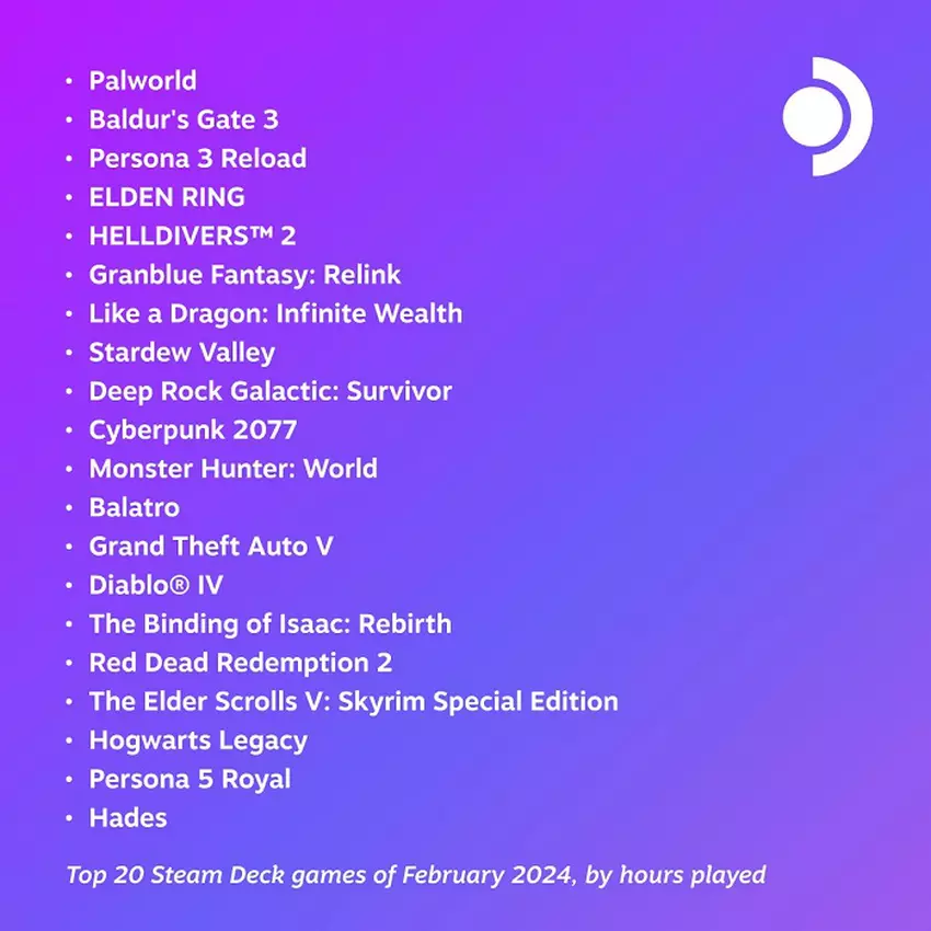 Elden Ring, Cyberpunk 2077 en Hogwarts Legacy verliezen hun populariteit niet, en de populaire shooter Helldivers 2 begon zijn "carrière" op Steam Deck vanaf de vijfde positie. Gezien de populariteit van dit spel zou het in maart wel eens op de kopposities kunnen staan.