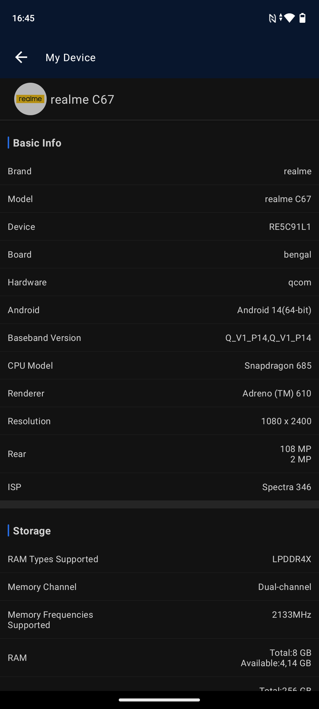 realme C67 draait op het nieuwste Android 14 OS met de eigen realme UI schil. De interface ligt heel dicht bij pure Android en heeft vooral cosmetische toevoegingen van realme, dus alles werkt en is op een vertrouwde manier georganiseerd, je hoeft er niet aan te wennen. Er zijn standaard bureaubladen, een apart menu met alle applicaties (je kunt het uitschakelen), widgets, navigatie met gebaren of knoppen en veel mogelijkheden om het uiterlijk aan te passen.