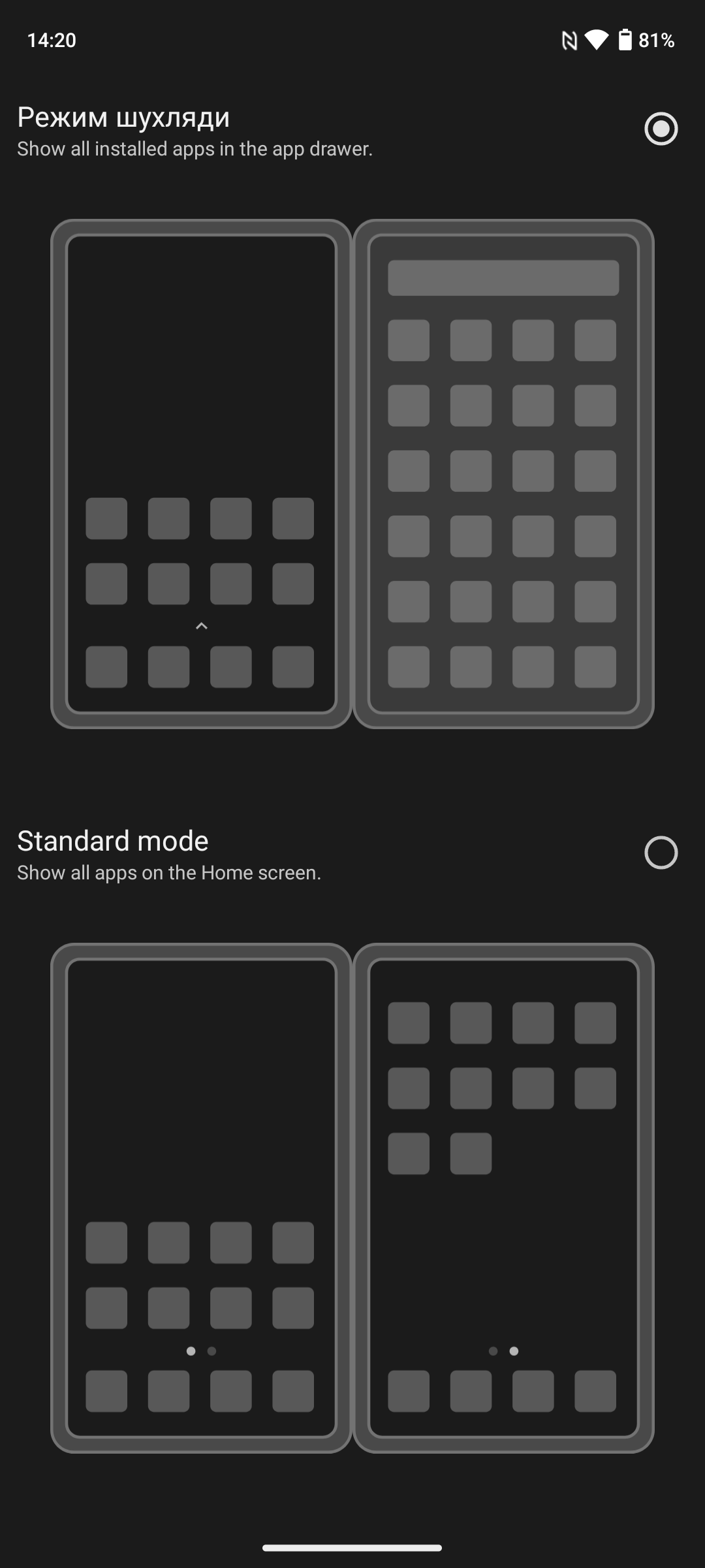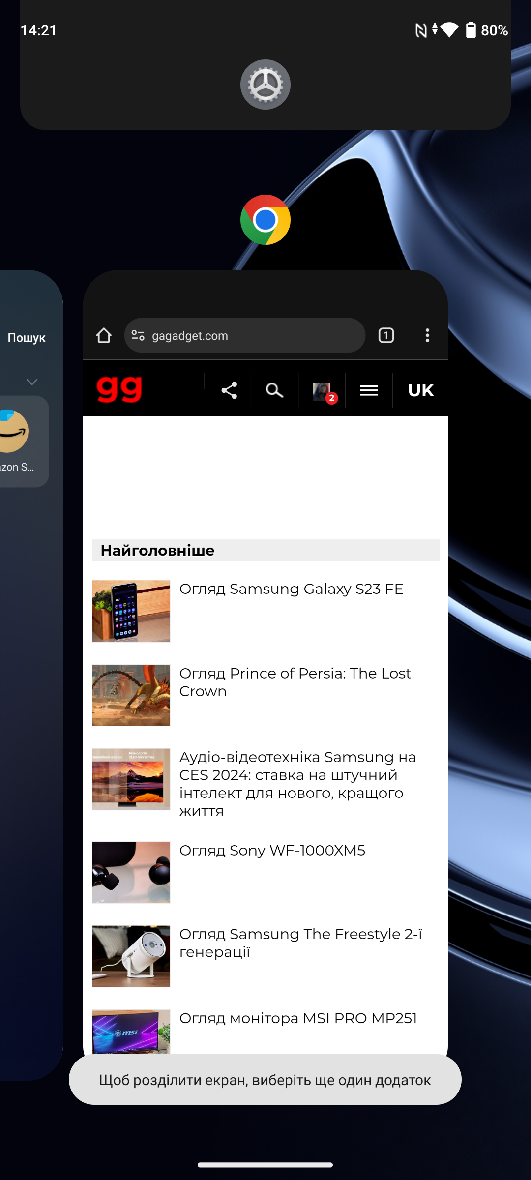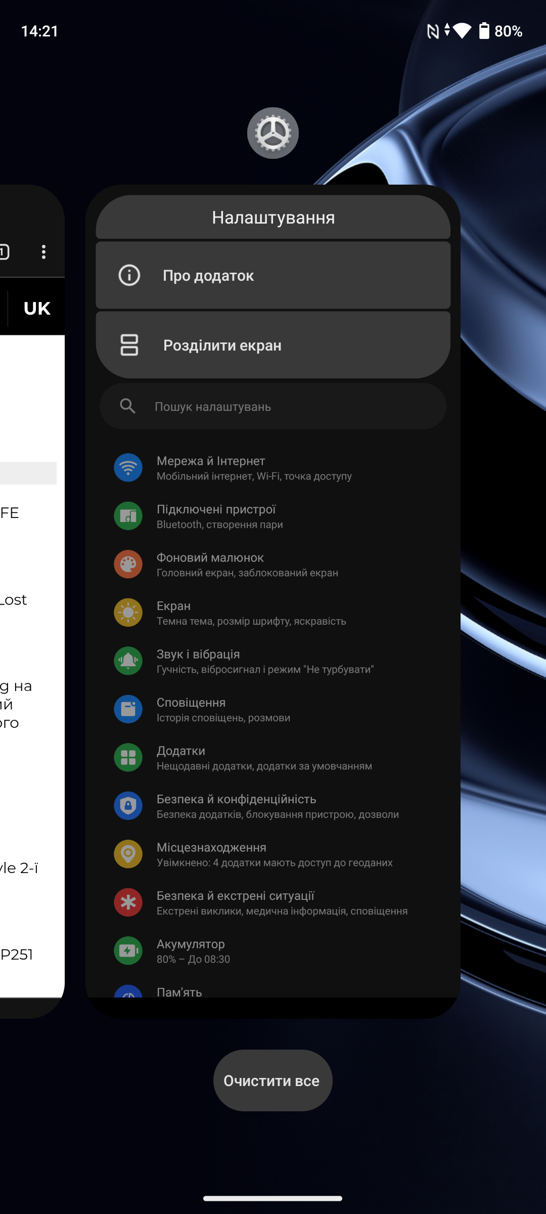 De applicatiebeheerder heeft een standaard uiterlijk en functionaliteit. De gebruikelijke horizontale carrousel van kaarten met de mogelijkheid om alles te sluiten of over te schakelen naar de twee-venstermodus: