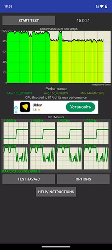 In de Throttling Test daalt de prestatie van de processor tot 81% in 15 minuten maximale belasting. De prestaties liggen ongeveer de eerste 6 minuten dicht bij het maximum, daarna is er een daling. Tegelijkertijd blijft de behuizing nauwelijks warm.