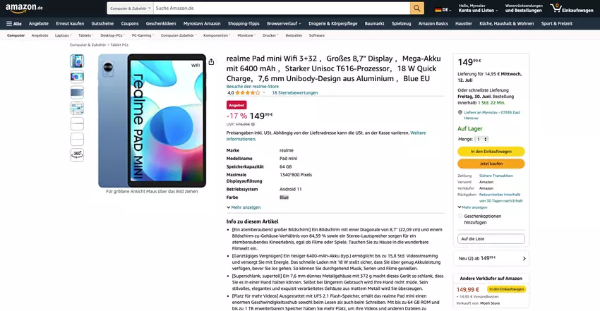 We hebben het over de realme Pad Mini. De Wi-Fi-versie van de tablet in blauw en 3/32 GB kost check price on amazon