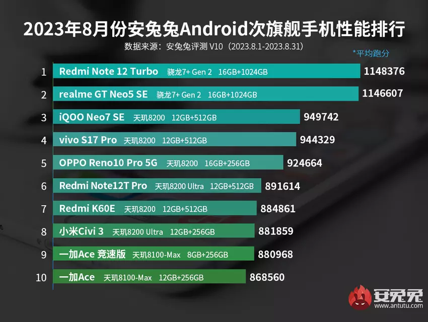 De Redmi Note 12 Turbo stond met een score van 1.148.376 punten bovenaan de prestatieranglijst voor de laatste maand van zomer 2023. De tweede plaats werd ingenomen door de Realme GT Neo 5 SE. Deze scoorde 1.146.607 punten. Beide smartphones zijn uitgerust met een Snapdragon 7+ Gen 2-processor.