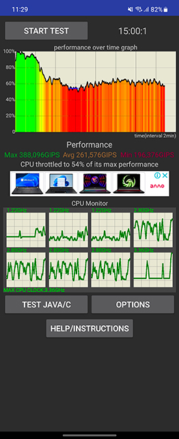 Een van de gebruikelijke problemen bij het ontwikkelen van clamshells met flexibele schermen is een zeer dichte lay-out binnenin vanwege de vormfactor. En dus problemen met koeling. Samsung Galaxy Flip5 ontsnapt ook niet aan dit probleem. Bij langdurige maximale belasting raakt de processor oververhit en verliest hij prestaties. De afname kan oplopen tot bijna 50%. Hoewel het in het echte leven erg moeilijk zal zijn om zo'n krachtige processor te overbelasten.