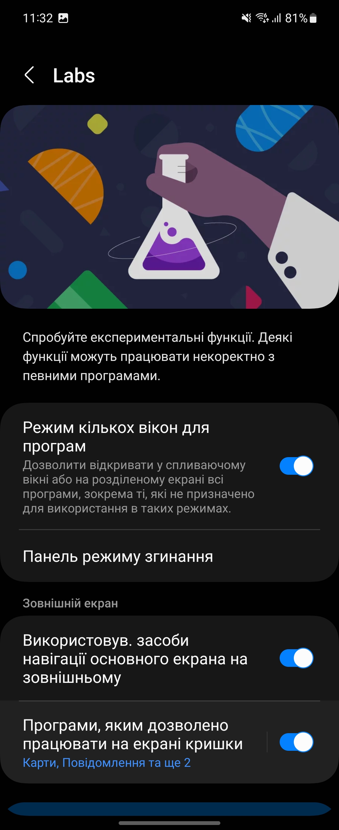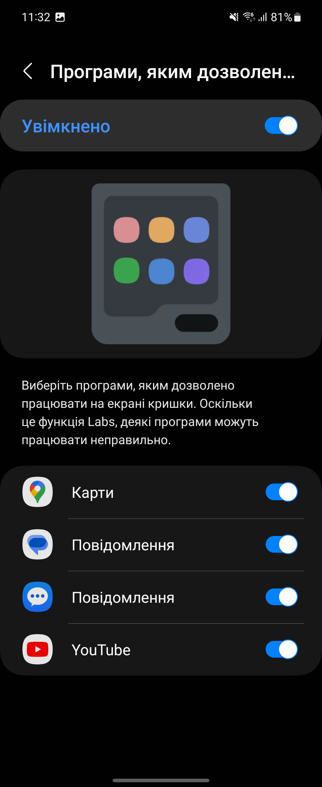Maar officieel is de ondersteuning voor apps op het externe scherm zeer beperkt: berichten, oproepen, kaarten, YouTube. Ze zijn ingeschakeld in het menu Labs experimentele instellingen.