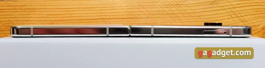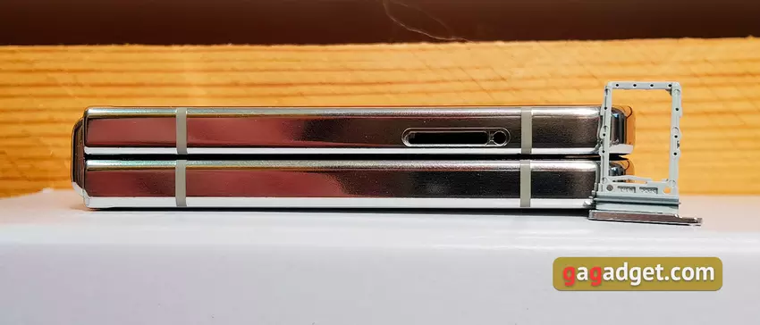 Uitgeklapt is de smartphone erg dun, slechts 6,9 mm. Aan de linkerkant bevindt zich een lade.
