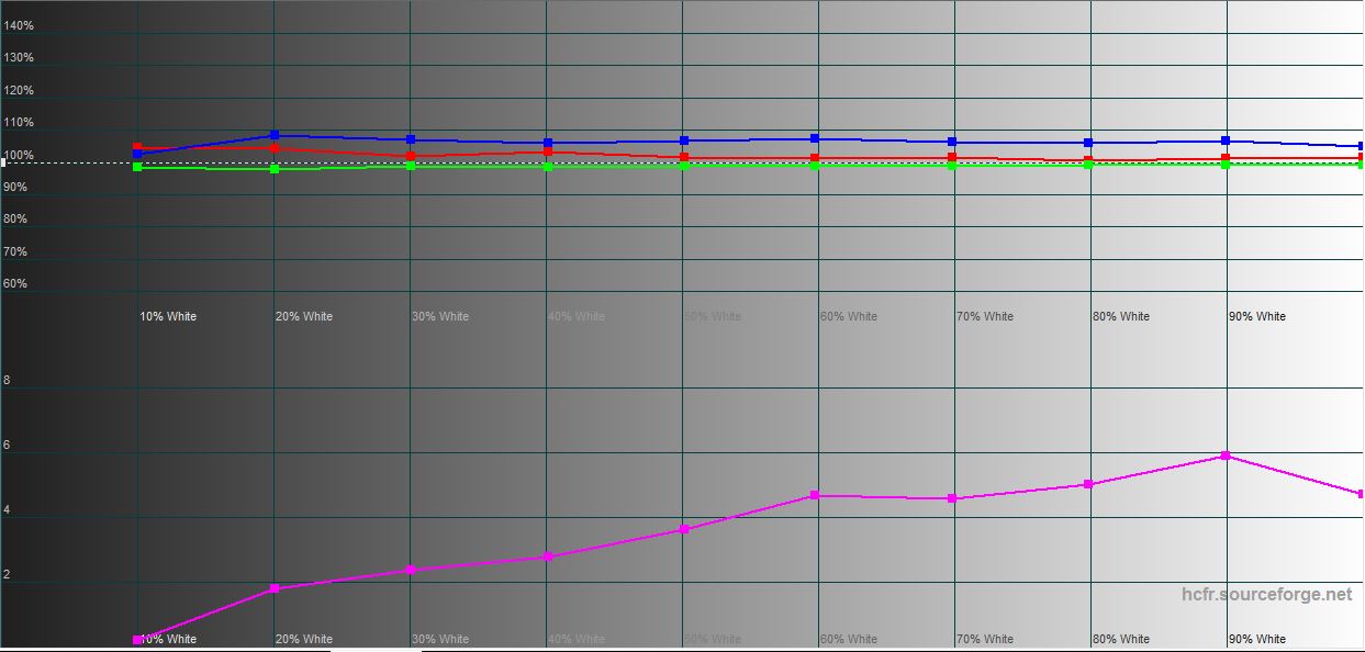 In de modus "Natuurlijk" ligt het kleurengamma dichter bij sRGB en is de kleurnauwkeurigheid iets minder nauwkeurig. De maximale helderheid is iets lager: 774,902 cd/m².