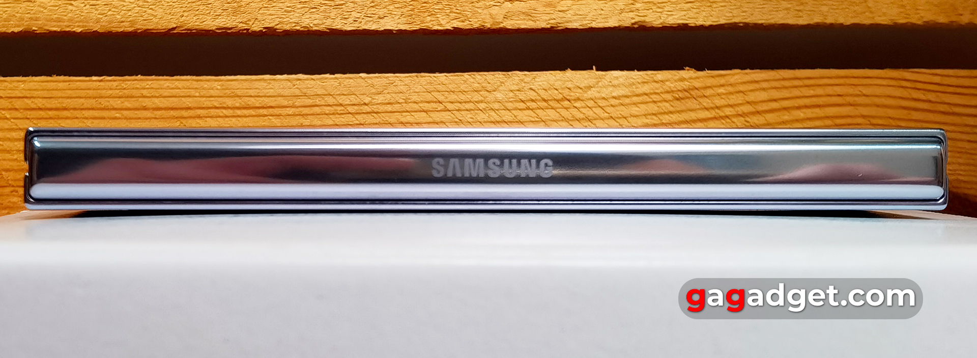 Het scharnier wordt bedekt door een metalen afdekking met het Samsung logo. Het is net als voorheen. Maar nu is er in plaats van een reliëfopschrift een gravure gebruikt.
