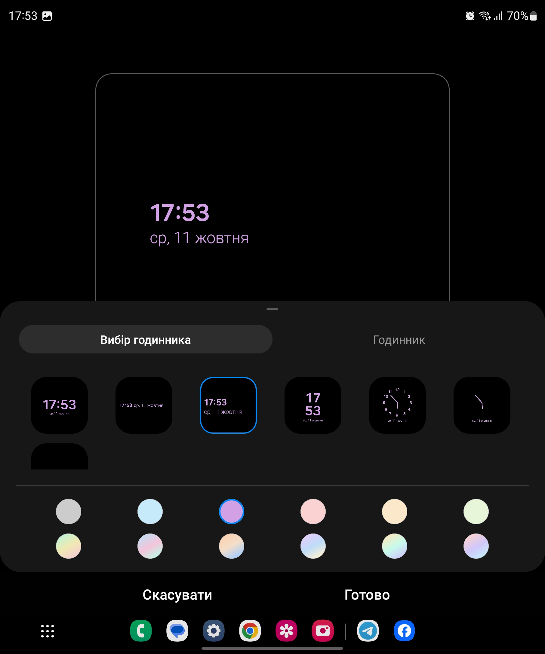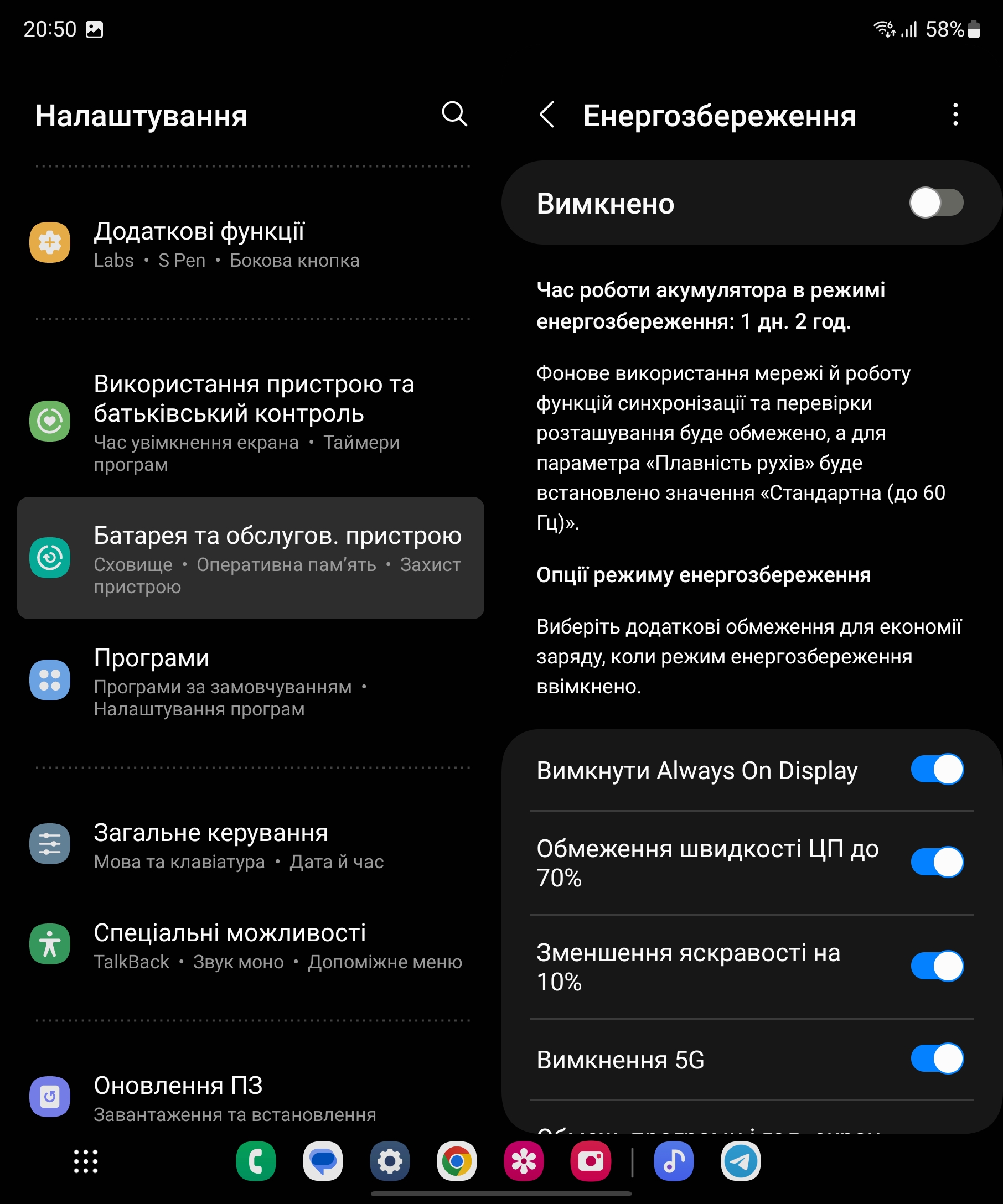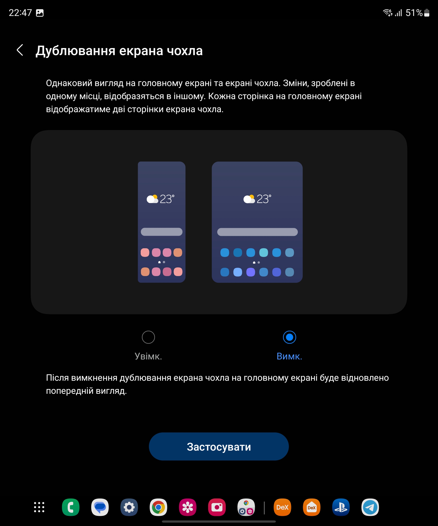 De instellingen zijn bijna standaard, zoals bij de meeste Samsung smartphones. Er is keuze tussen licht- en donkermodi (automatisch schakelen volgens schema is mogelijk), helderheid, verversingssnelheid, oogcomfort (automatische aanpassing van de kleurtemperatuur afhankelijk van het omgevingslicht), modi voor kleurweergave (verzadigde of natuurlijke kleuren en kleurtemperatuurinstellingen), lettertype en lettergrootte, schaal van interface-elementen en verdeling in twee kolommen voor efficiënter ruimtegebruik (de functie is alleen beschikbaar voor het interne vouwdisplay), evenals Always on Display.