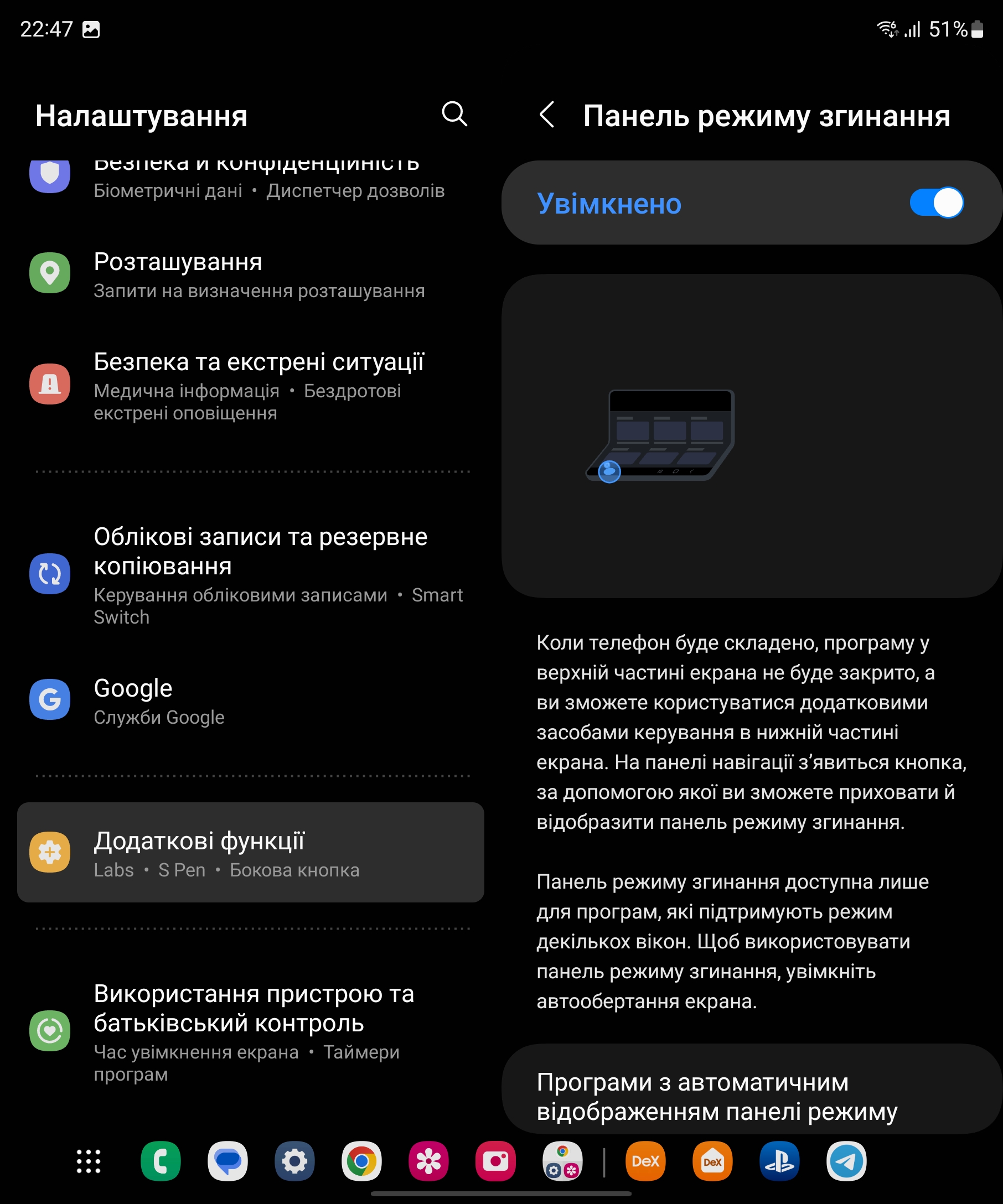 Alle Fold-smartphones, inclusief de Samsung Galaxy Fold5, zijn ontworpen om een mobiele alles-in-één "combinatie" te zijn voor het maximale aantal taken. Het externe scherm is voldoende voor gesprekken, instant messengers, berichten, mail, het gebruik van de camera en het schakelen tussen muzieknummers. In het algemeen alle eenvoudige taken die onderweg of onderweg kunnen voorkomen. Als je het scherm vergroot, is het interne scherm van 7,6 inch handiger voor het werken met documenten, het gebruiken van een browser, het lezen van boeken of het spelen van games (de meeste games zijn voldoende groot). Bij video is het voordeel niet zo groot vanwege de niet-standaard beeldverhouding. De zwarte gebieden onder en boven blijven vrij groot. Maar het grote scherm is niet het enige kenmerk. We moeten ook de extra softwarefuncties voor gebruiksgemak noemen die in de vorige generatie verschenen met One UI 4.1.1 en Android 12L, dat geoptimaliseerd was voor opvouwbare smartphones. In de Samsung Galaxy Fold5 kun je tot drie applicaties tegelijk openen op het hoofdscherm, hun volgorde en grootte wijzigen en deze instellingen opslaan om snel te starten vanuit de zijbalk. Ook is de onderste balk met snelkoppelingen voor applicaties behouden en verbeterd ten opzichte van de vorige generatie, wat doet denken aan een soortgelijke oplossing in pc-besturingssystemen. Dit paneel kan nu tot 12 apps bevatten, waaronder de 4 nieuwste.
