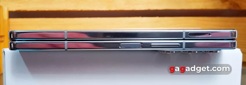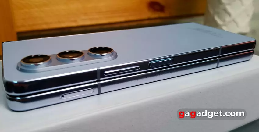 Er zijn niet veel verschillen tussen Samsung Galaxy Fold5 en Fold4, maar ze zijn er wel. Ten eerste is het de moeite waard om het vernieuwde scharnier te vermelden. Dankzij het nieuwe druppelvormige ontwerp zijn de technici van Samsung er eindelijk in geslaagd om de opening tussen de smartphonehelften bij het opvouwen, die bij alle vorige modellen aanwezig was, te verwijderen. Naast het esthetische aspect verzamelt de smartphone geen stof meer binnenin. Dit maakte het ook mogelijk om de dikte van de smartphone te verminderen: 13.4 mm in opgevouwen toestand en 6,1 mm in uitgevouwen toestand tegenover respectievelijk 15,8 en 6,3 mm bij de Galaxy Fold4. Maar de vouw op het scherm is er nog steeds. Laten we hopen dat de volgende generatie dit eindelijk kan verwijderen.