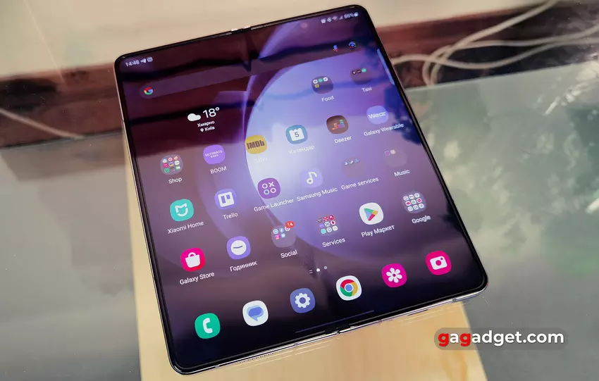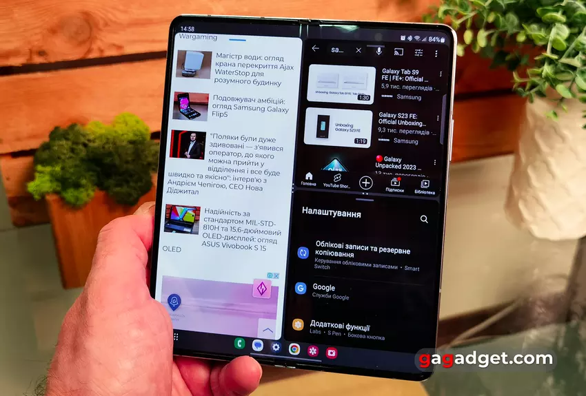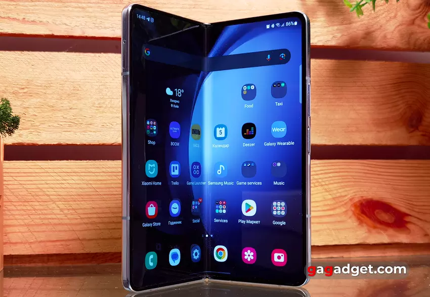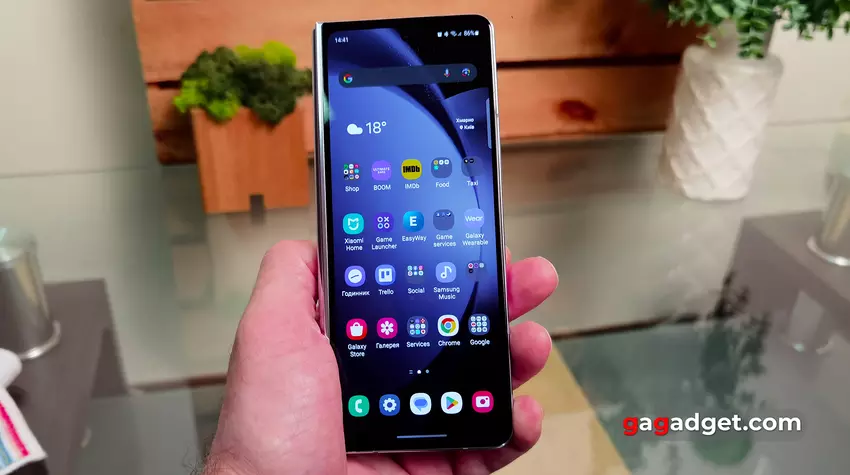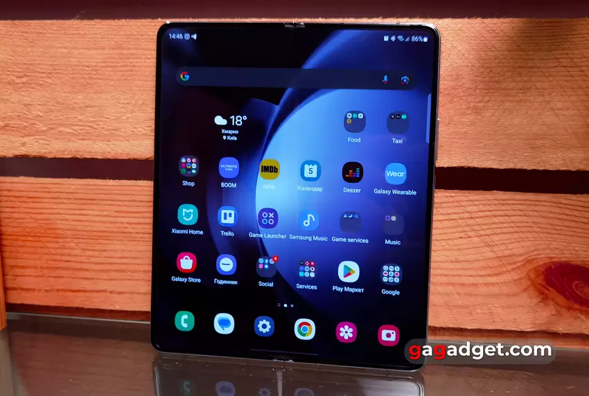 Alle Fold-smartphones, inclusief de Samsung Galaxy Fold5, zijn ontworpen om een mobiele alles-in-één "combinatie" te zijn voor het maximale aantal taken. Het externe scherm is voldoende voor gesprekken, instant messengers, berichten, mail, het gebruik van de camera en het schakelen tussen muzieknummers. In het algemeen alle eenvoudige taken die onderweg of onderweg kunnen voorkomen. Als je het scherm vergroot, is het interne scherm van 7,6 inch handiger voor het werken met documenten, het gebruiken van een browser, het lezen van boeken of het spelen van games (de meeste games zijn voldoende groot). Bij video is het voordeel niet zo groot vanwege de niet-standaard beeldverhouding. De zwarte gebieden onder en boven blijven vrij groot. Maar het grote scherm is niet het enige kenmerk. We moeten ook de extra softwarefuncties voor gebruiksgemak noemen die in de vorige generatie verschenen met One UI 4.1.1 en Android 12L, dat geoptimaliseerd was voor opvouwbare smartphones. In de Samsung Galaxy Fold5 kun je tot drie applicaties tegelijk openen op het hoofdscherm, hun volgorde en grootte wijzigen en deze instellingen opslaan om snel te starten vanuit de zijbalk. Ook is de onderste balk met snelkoppelingen voor applicaties behouden en verbeterd ten opzichte van de vorige generatie, wat doet denken aan een soortgelijke oplossing in pc-besturingssystemen. Dit paneel kan nu tot 12 apps bevatten, waaronder de 4 nieuwste.