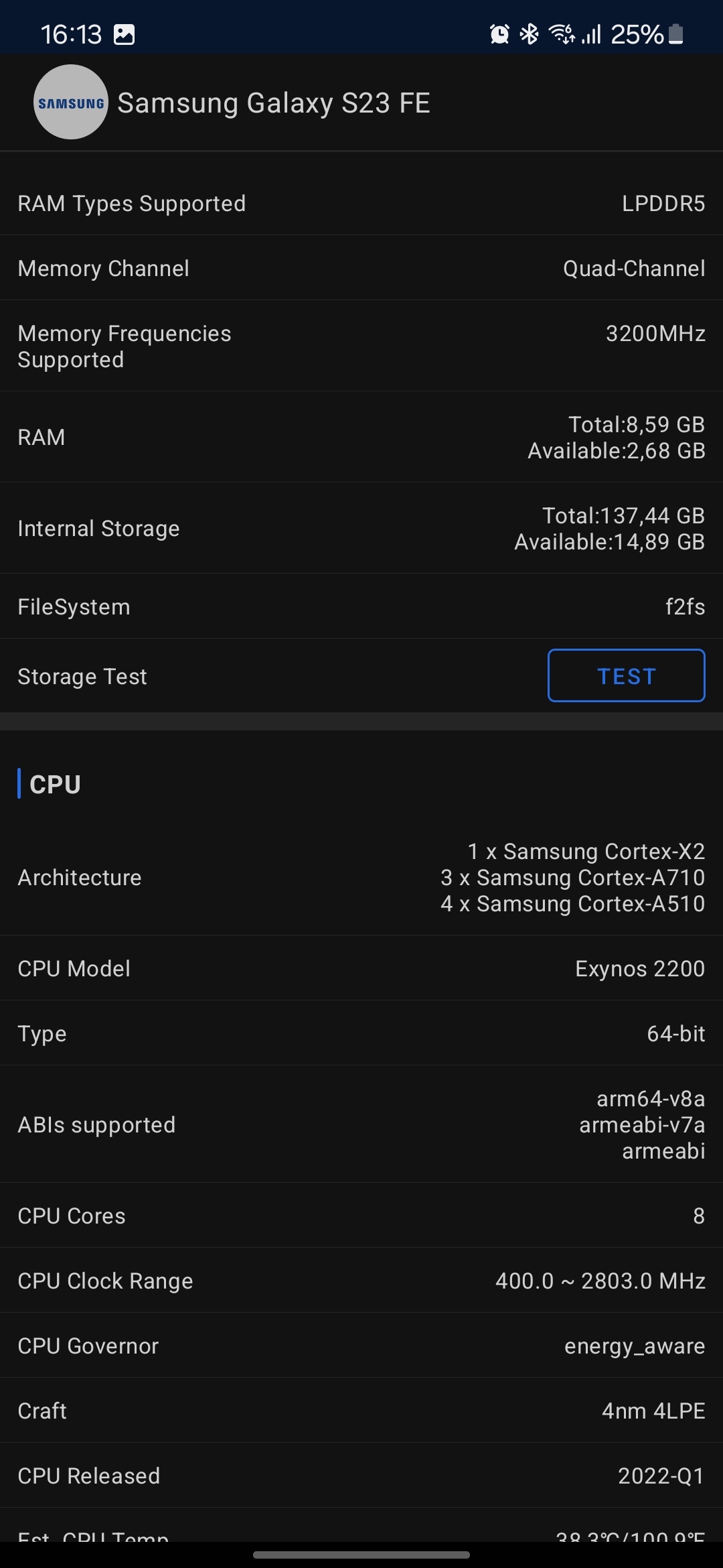 Flagship lijn Samsung Galaxy S23 ontving de topprocessor Qualcomm Snapdragon 8 Gen 2 Mobile Platform voor Galaxy. Op zijn beurt besloot de jongere Samsung Galaxy S23 FE zijn eigen vlaggenschip processor uit de vorige Galaxy S22 lijn te installeren, namelijk Samsung Exynos 2200. De uitzondering is de Amerikaanse versie, die de Qualcomm Snapdragon 8 Gen 1kreeg. Samsung Exynos 2200 is een 4-nanometer octa-core processor met één ARM Cortex-X2 kern geklokt op 2,8 GHz, drie ARM Cortex-A710 kernen op 2,5 GHz, en vier energiezuinige ARM Cortex-A510 1,7 GHz. Graphics wordt verzorgd door de samen met AMD ontwikkelde Xclipse 920 versneller gebaseerd op de RDNA 2 architectuur met ondersteuning voor ray tracing en Variable Rate Shading (VRS). Hoewel de Exynos 2200 iets onderdoet voor de oplossingen van Qualcomm, is het een krachtige processor met voldoende prestaties voor de meeste taken. Hij heeft 8 GB RAM en 128 GB of 256 GB interne opslagruimte. We bespreken de junior versie. En eigenlijk is dat nu geen optie meer: na het installeren van de basisset applicaties, benchmarks, een paar zware games en het downloaden van muziek is er nog ongeveer 10 GB over. Er is geen MicroSD slot, dus het is beter om meteen naar de 256 GB versie te kijken.
