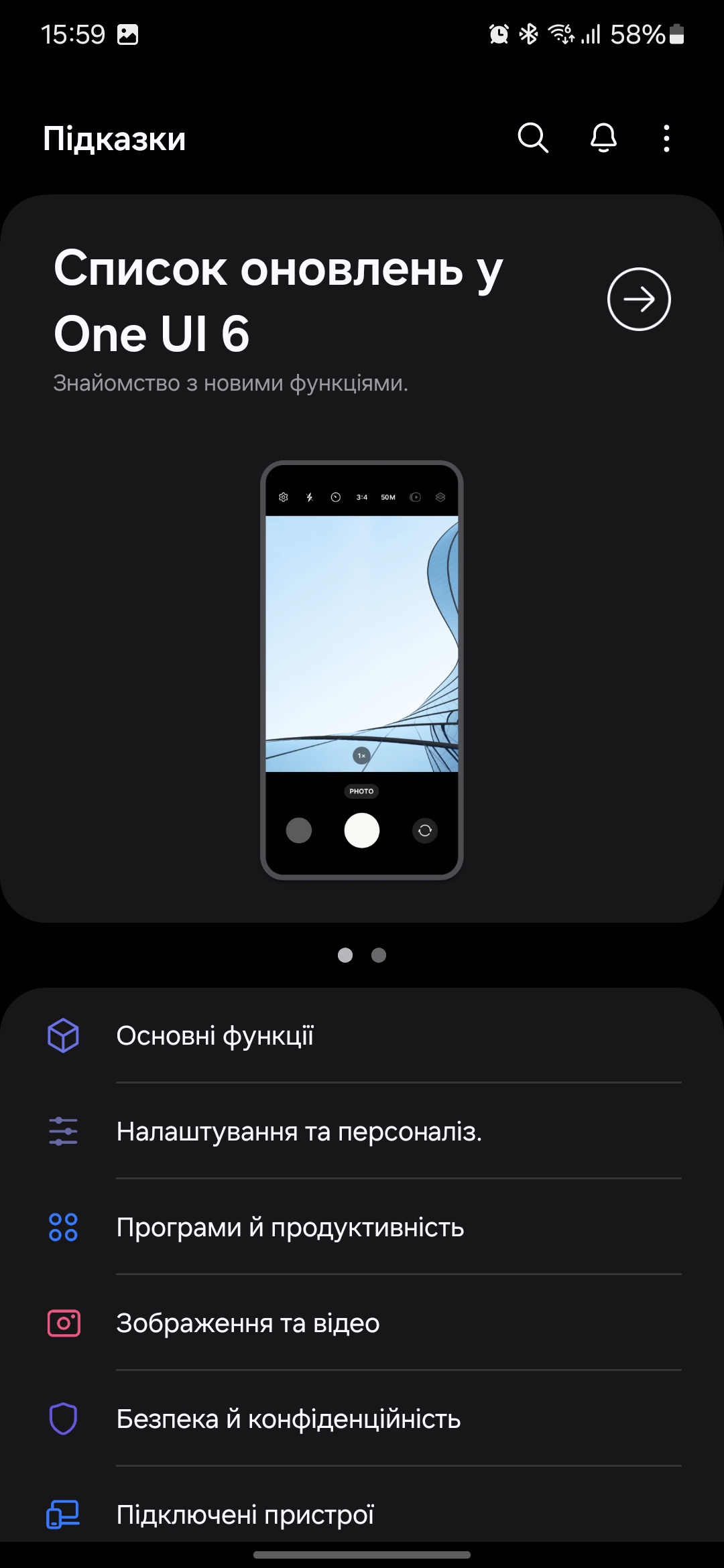 Op het moment van de review draait de Samsung Galaxy S23 FE al op Android 14 met de eigen OneUI 6.0 schil. Er zijn geen drastische wijzigingen ten opzichte van OneUI 5.1 op Android 13. Sommige dingen zijn hertekend. Sommige dingen zijn een beetje hertekend, sommige niet-kritieke functies zijn toegevoegd, dus over het algemeen hoef je niet te wennen aan de nieuwe schil. De tips sectie op de smartphone zelf bevat een korte beschrijving van de verbeteringen, en de volledige lijst is te vinden op. De veranderingen die Samsung benadrukt zijn onder andere: snel wisselen tussen cameraresoluties, extra bescherming tegen schadelijke content in apps en andere gedownloade content, meer foto- en videobewerkingsopties, een nieuwe Studio video-editor, het overzetten van Samsung smartwatchgegevens met Smart Switch, snel kopiëren tussen verschillende apparaten met hetzelfde Samsung-account en het met twee handen overzetten van pictogrammen of content.