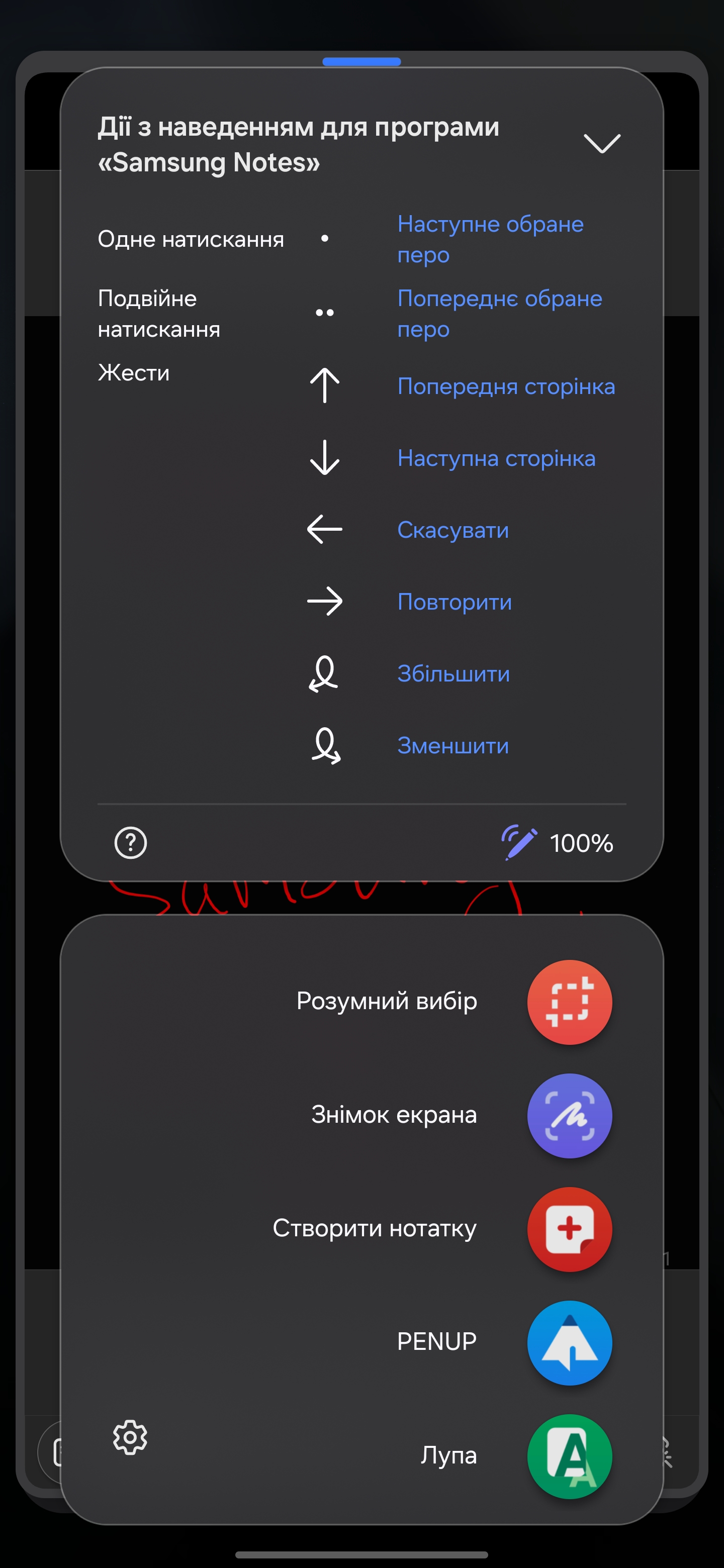 De S Pen is niet veranderd sinds de vorige generatie. Hij kan tot 4096 drukniveaus en hellingshoeken herkennen. De S Pen is uitgerust met een Bluetooth LEmodule, gyroscoop, versnellingsmeter en een enkele mechanische knop. De pen kan worden gebruikt als afstandsbediening. In verschillende apps kun je verschillende gebaren instellen met de stylus in de lucht: van track wisselen, pauzeren, afspelen in de speler, zoomen, van camera wisselen en van cameramodus wisselen, etc.