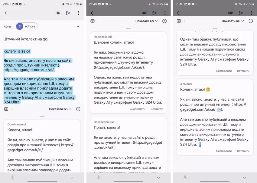 Maar de belangrijkste functie van OneUI 6.1 is Galaxy AI. In de afgelopen jaren hebben we al veel toepassingen gezien van zogenaamde kunstmatige intelligentie, neurale netwerken, grote taalmodellen en machine learning op verschillende manieren. Dit omvat het verbeteren of genereren van afbeeldingen, het vertalen van verschillende talen, het opmaken of zoneren van teksten, enz. Over het algemeen is dit allemaal beschikbaar in verschillende vormen in verschillende applicaties of diensten. Samsung heeft besloten om dit alles te combineren in het Galaxy AI-platform op zijn smartphones en zo de gebruikerservaring van zijn smartphones te verbeteren. En de meeste van deze functies zullen offline beschikbaar zijn. Je kunt meer lezen over alle Galaxy AI functies in ons aparte artikel. Vandaag vermelden we alleen de belangrijkste functies in algemene termen. Het vernieuwde toetsenbord van Samsung heeft ingebouwde functies die gebruikmaken van neurale netwerken en kunnen helpen bij het opmaken van tekst. Wanneer je met vrienden communiceert, is dit niet zo belangrijk. Maar als je communiceert met vreemden of in zakelijke correspondentie, kan de mogelijkheid om tekst stilistisch om te zetten in meer formele of zakelijke versies handig zijn.