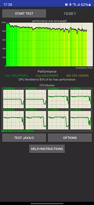 Samsung Galaxy S24 Ultra heeft een 1,9x grotere 1,9x grotere verdampingskamer in vergelijking met de Galaxy S23 Ultra. Maar de Qualcomm Snapdragon 8 Gen 3 is iets heter dan zijn voorganger. In de CPU Throttling Test stresstest dalen de prestaties tot ongeveer 83% in 15 minuten en wordt de smartphone zelf warm, niet heet. Hoewel het in echte omstandigheden vrij moeilijk zal zijn om de processor op een dergelijke manier te belasten.