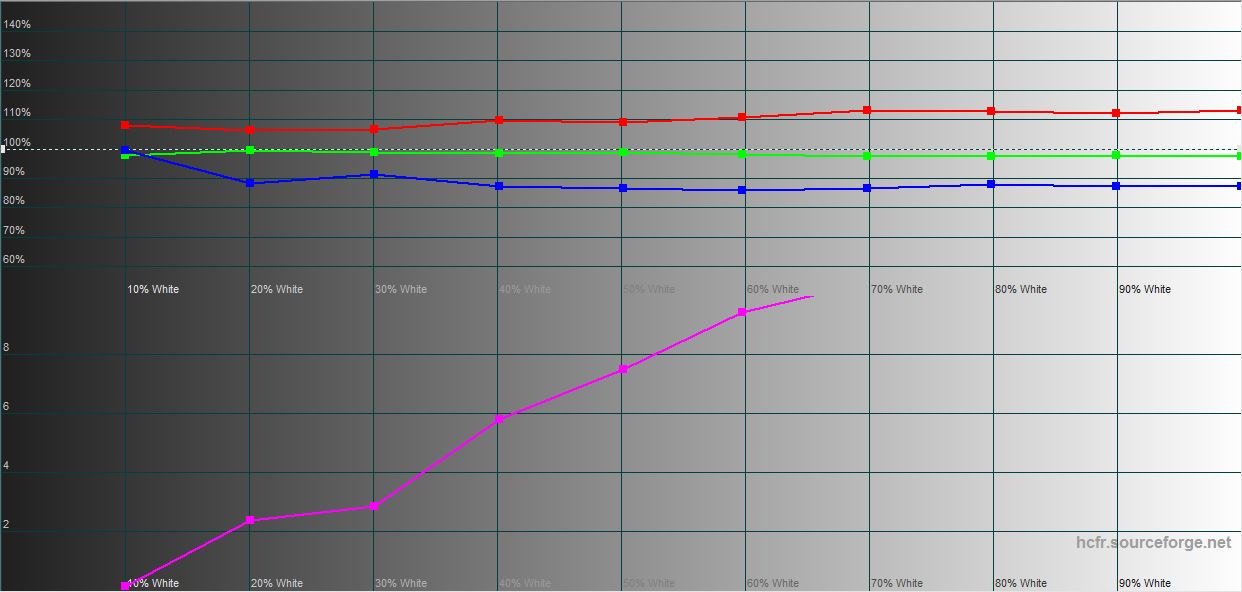 En nu een paar woorden over minder prettige dingen. Er zijn enkele problemen met de huidige firmware die het scherm beïnvloeden. Ten eerste is het kleurengamma in de verzadigde modus slechts iets breder dan sRGB. Dit is erg vreemd: meestal hebben Samsung schermen een veel breder kleurengamma. Ten tweede is er bijna geen verschil in de kleurweergave als je van modus wisselt en de adaptieve kleurtoonfunctie werkt niet. We wachten dus op een update en de hardwaremetingen kunnen voorlopig tussenmaats worden genoemd. MDe maximale helderheid in de verzadigde modus was 721,58 cd/m2, het kleurengamma is minimaal hoger dan sRGB, de kleuren neigen lichtjes naar koude tinten.
