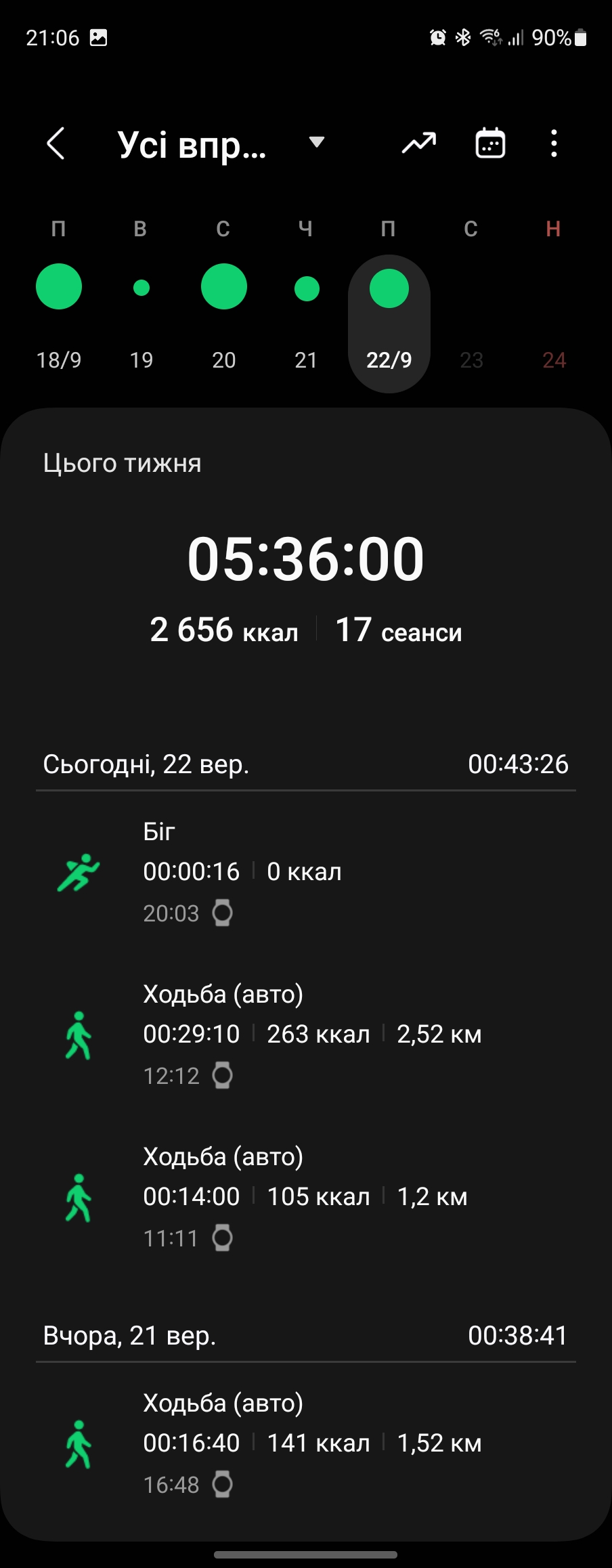 De mogelijkheden van de Samsung Galaxy Watch6 Classic op het gebied van lichaamsconditie en training zijn vrij uitgebreid. Het horloge kan je hartslag bijhouden (inclusief automatische meting elke 10 minuten), zuurstofverzadiging in het bloed, stressniveau, slaapkwaliteit (met tips om deze te verbeteren, snurken bijhouden en temperatuur meten), stappen tellen, snelheid en route registreren met behulp van de ingebouwde GPS, en nog veel meer. De meetnauwkeurigheid is hoog voor een niet-gespecialiseerd apparaat. Dit geldt tenminste voor stappen, afstand, route, slaap en hartslag. Je kunt de nauwkeurigheid van deze indicatoren eenvoudig zelf controleren. De fout bij het meten van de hartslag is bijvoorbeeld meestal niet meer dan 1-2%. Er zijn veel trainingsprogramma's beschikbaar, waaronder hardlopen, krachttraining op machines, zwemmen in verschillende omstandigheden, yoga, enz.