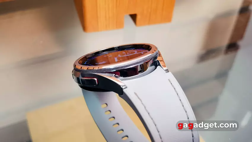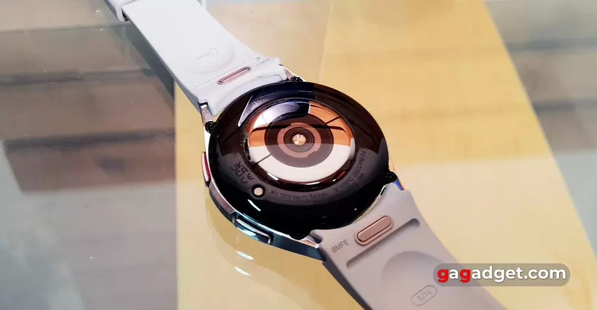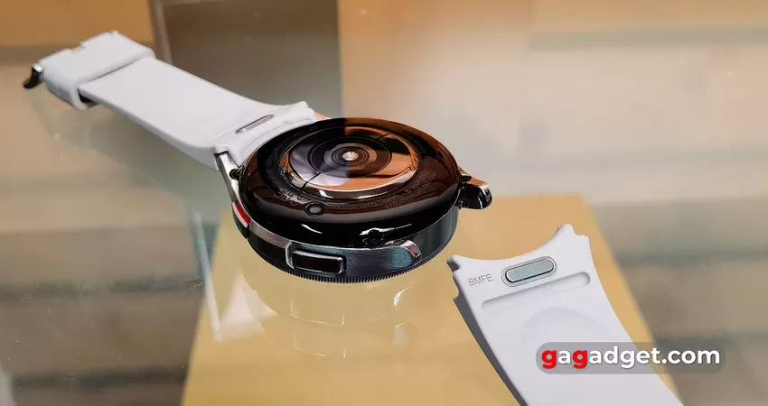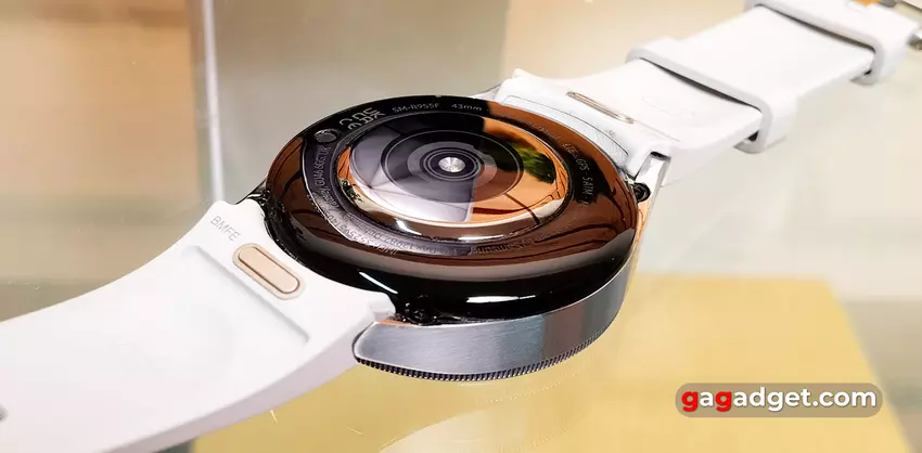 De achterkant van het horloge is gemaakt van glas en keramiek en heeft veel functionele elementen. Samsung BioActive biosensoren, een optische hartslagsensor en een infraroodtemperatuursensor, en een drukontlastingsgat. De infraroodtemperatuursensor wordt gebruikt om verschillende indicatoren van de lichaamsconditie te meten. Bijvoorbeeld tijdens de slaap. Maar Samsung Galaxy Watch6 Classic heeft geen temperatuurmeetfunctie. Bovendien zal de meting op zo'n plek niet erg representatief zijn. Het bedrijf heeft echter een API geopend voor de temperatuursensor, zodat softwareontwikkelaars deze kunnen gebruiken in hun applicaties.