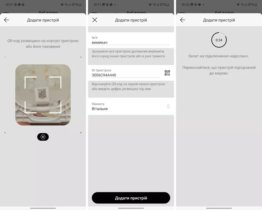 Je kunt een stopcontact of schakelaar aan de app toevoegen zoals elk ander Ajax-apparaat: selecteer het betreffende item in het menu nadat je het stopcontact of de schakelaar hebt aangesloten (ze moeten van stroom worden voorzien) en scan de QR-code. Het enige verschil is dat het stopcontact meteen wordt toegevoegd en om de schakelaar met de centrale te verbinden, moet je Button installeren, omdat de radioantenne zich daarin bevindt.