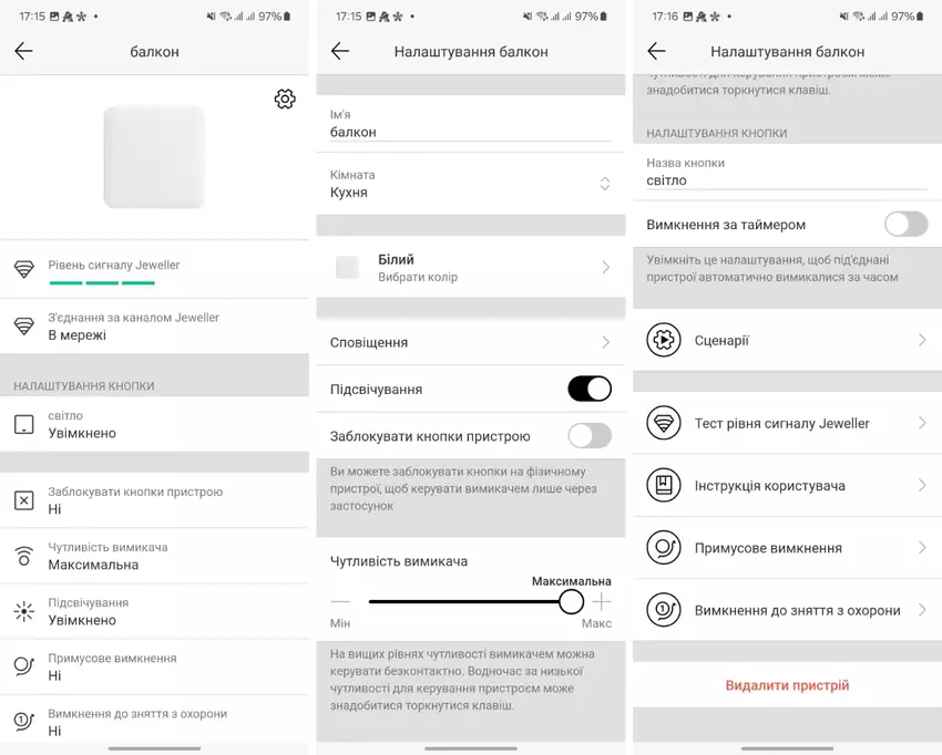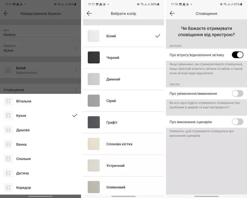 Je kunt de kamers van de apparaten veranderen, de kleur van de schakelaar kiezen (dit heeft alleen invloed op de animatie in de app - de schakelaar ziet er hetzelfde uit). En je kunt bijvoorbeeld meldingen van het apparaat uitschakelen die het niet naar de app stuurt. Of alleen de belangrijke meldingen laten staan (ik heb de melding over het verlies van communicatie laten staan, maar ik vermoed dat ik die na de eerste stroomstoring zal uitschakelen, omdat elke schakelaar deze onmiddellijk zal versturen en ik er enkele tientallen tegelijk zal ontvangen van alle Ajax-apparaten).
