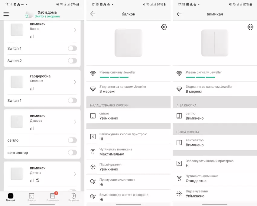 Eindelijk zijn alle schakelaars aangesloten en toegevoegd aan de Ajax-app. Nu kun je in de instellingen van elk apparaat een aparte naam geven en elke schakelaar een naam geven (voor gekoppelde apparaten kun je twee namen opgeven - ik heb bijvoorbeeld een licht en een ventilator).