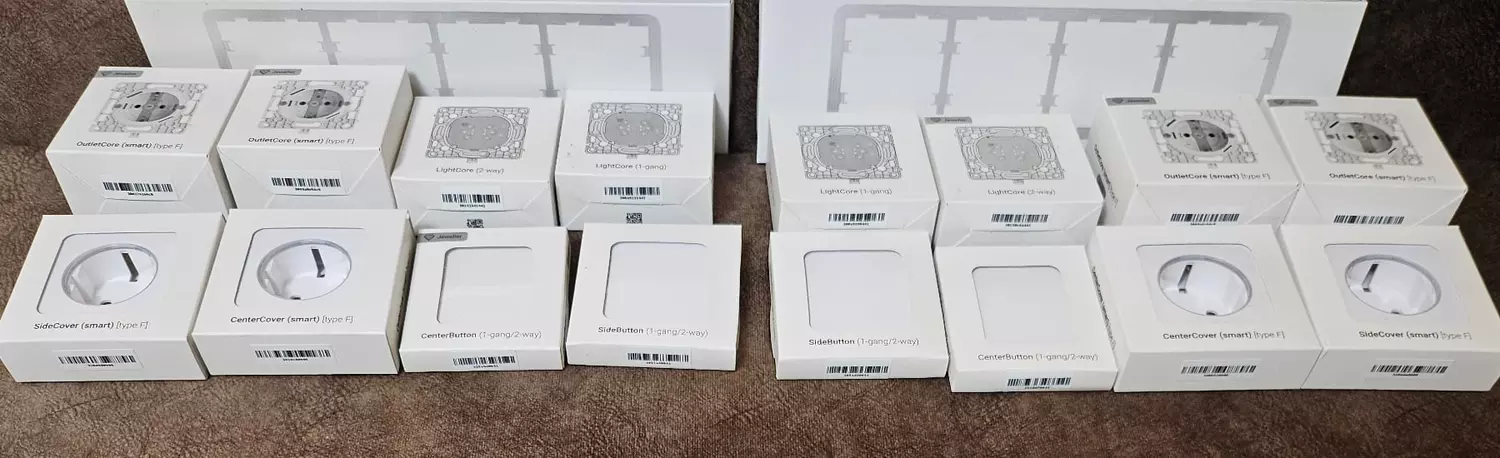 Het zou esthetisch onaantrekkelijk zijn om 2 eenheden van twee "gewone" contactdozen en twee Ajax LightSwitches te installeren. Het zou er zelfs uitzien als een regelrechte misdaad tegen het prachtige ontwerp van Ajax-schakelaars. Daarom heb ik de moedige beslissing genomen om nieuwe Ajax Outlet stopcontacten aan de set toe te voegen, die net beschikbaar zijn gekomen. Vanuit het oogpunt van budget en gezond verstand was het nog steeds logisch om 15 slimme schakelaars in een nieuw appartement te installeren. Maar het installeren van 127 slimme, hightech stopcontacten met alle draadloze protocollen en een geavanceerd ontwerp (en niet goedkoop) leek onzinnig. Terwijl het installeren van 5 stopcontacten puur voor de esthetiek (ik weet niet zeker of ik hun slimme functies nodig zal hebben, maar we zullen zien) iets is waar een gezinsbudget nog op kan rekenen.