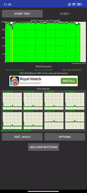 Xiaomi Redmi Note 13 Pro+ 5G was een aangename verrassing op het gebied van verwarming en prestatiestabiliteit. Er wordt een vrij grote verdampingskamer gebruikt. In de Throttling Test daalt de processor tot 94% in 15 minuten maximale belasting, wat een zeer goede indicator is. Het lichaam kan een beetje warm worden in synthetische tests en tijdens lange gamesessies, maar het wordt warm, niet heet.